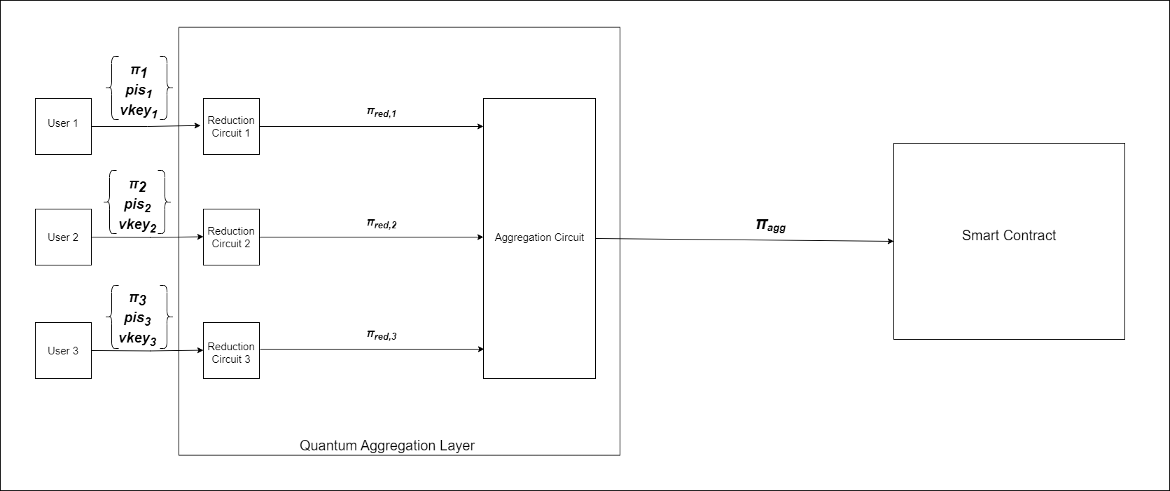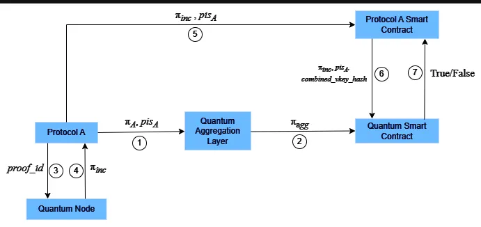 * The aggregated proof $$\pi\_{agg}$$ is verified on the Quantum Contract, upon successful verification the individual proofs within $$\pi\_{agg}$$ are considered valid